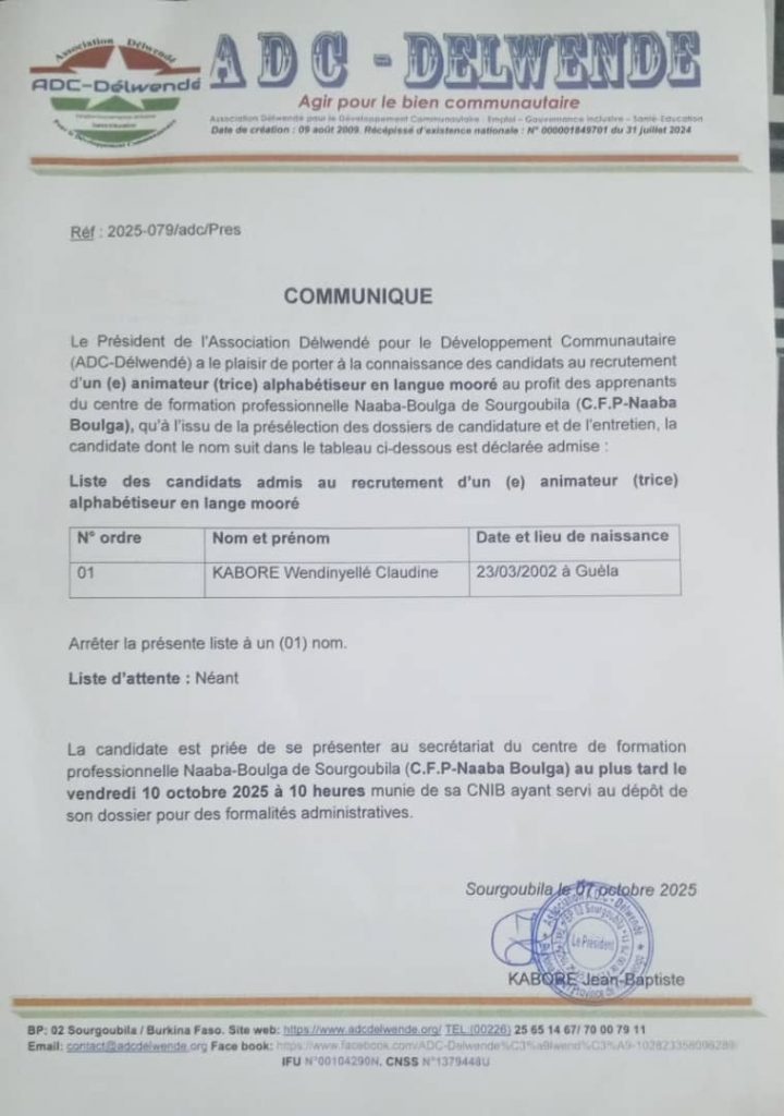 Le Président de l’Association Délwendé pour le Développement Communautaire (ADC-Délwendé) a le plaisir de porter à la connaissance des candidats au recrutement d’un (e) animateur (trice) alphabétiseur en langue mooré au profit des apprenants du centre de formation professionnelle Naaba-Boulga de Sourgoubila (C.F.P-Naaba Boulga), qu’à l’issu de la présélection des dossiers de candidature et de l’entretien, la candidate dont le nom suit dans le tableau ci-dessous est déclarée admise: