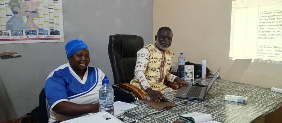 Le directeur exécutif (d) Jean-Baptiste Kaboré et l’animatrice Noélie Ouédraogo (g) lors des travaux